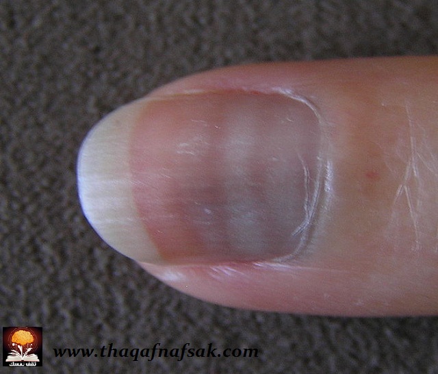 2 – وفي حالة تغيّر لون الظفر من الوردي إلى الأبيض فإن ذلك يعني الأنيميا ( فقر الدم ) الناتجة عن نقص البروتين والفيتامينات والسكر أو اضطراب في الدورة الدموية بسبب نقص الأوكسجين في الدم …
